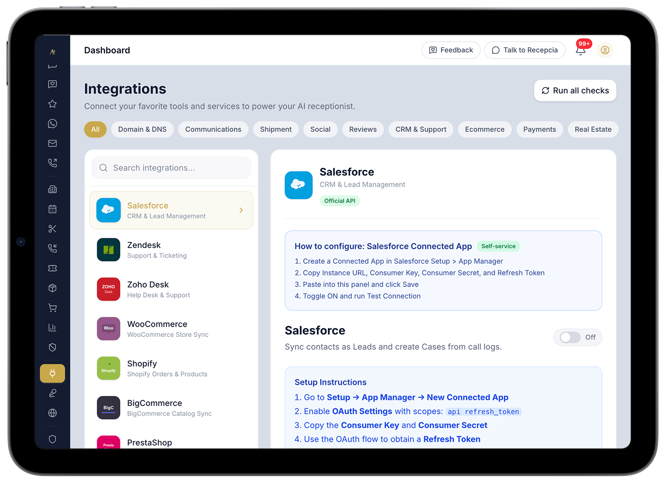 Use our robust API and webhooks to connect AI Recepsia to any internal system or proprietary software you use.